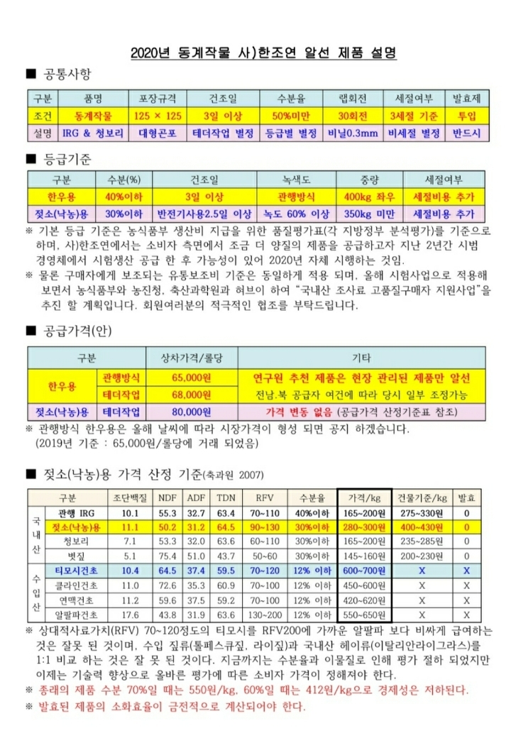 수분 10-12%의 수입건초 티모시 700원대에 비하여, 국내산 IRG 수분 60~70%대의 제품이 200원이라도 안쓰는 이유는 건물가 기준 660원/kg정도 되는 것이다.