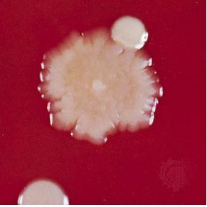 스타필로코쿠스 : 전형적인 세균의 배양:여성의 질에서 배양된 호기성(好氣性) 세균인 젖산간균속(Lactobacillus, 큰 콜로니)과 통성혐기성균(通性嫌氣性菌)인 스타필로코쿠스 알부스(Staphylococcus albus, 작은 콜로니), 11배 확대