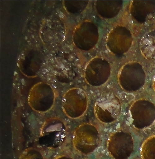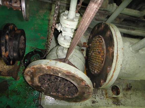 ▲열교환기 커버를 분리한 모습 내부에 홍합 등의 조개, 따개비로 일부 폐색되어 해수의 흐름을 방해하고 있음