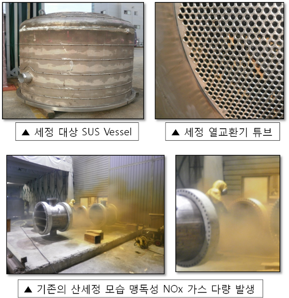아래의 참고 사진은 기존의 산 세정 방법과, 새로운 산 세정 방법의 모습을 보여 줍니다.