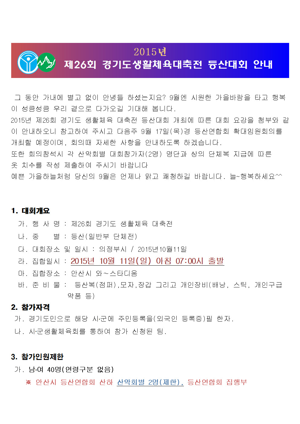 제26회 경기도 생활체육 대축전 등산대회 안내 작성자오상구|작성시간15.09.12|조회수52 목록 댓글 0 글자크기 작게가 글자크기 크게가 다음검색 현재 게시글 추가 기능 열기 북마크 공유하기 신고 센터로 신고 댓글 댓글 0 댓글쓰기 답글쓰기 댓글 리스트