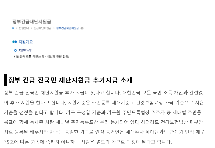 시 재난에 대한 정부 긴급 지원이 추가로 지급되고 있다고 한다. 대한민국의 모든 국민소득과 상관없이 추가 지원이 이뤄질 것이라고 한다. 지원 기준은 거주자가 등록한 세대 및 건강보험에 기초하여 결정된다. 세대별 인구등록표에 함께 기재된 가구구성일 현재에도 민법 제778조에 따라 피부의 운반자로 등록된 배우자와 자녀는 가족 이외의 단독가구로 간주한다.
