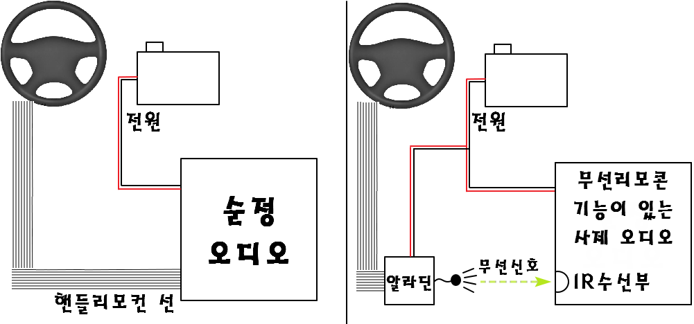 핸들리모컨의 신호를 알라딘이 받은 후 사제오디오의 리모컨 신호로 바꿔 쏴주게 됩니다.