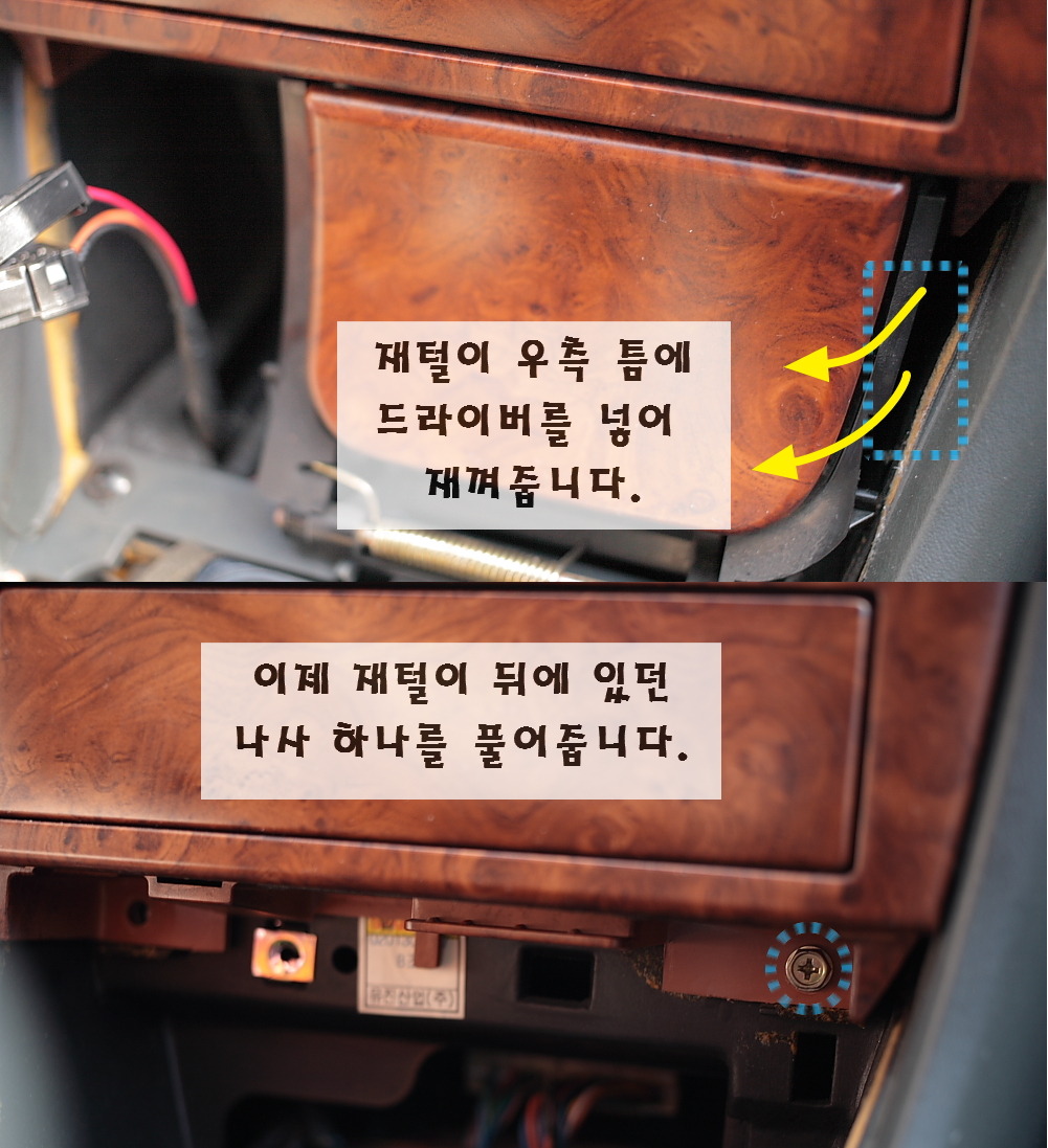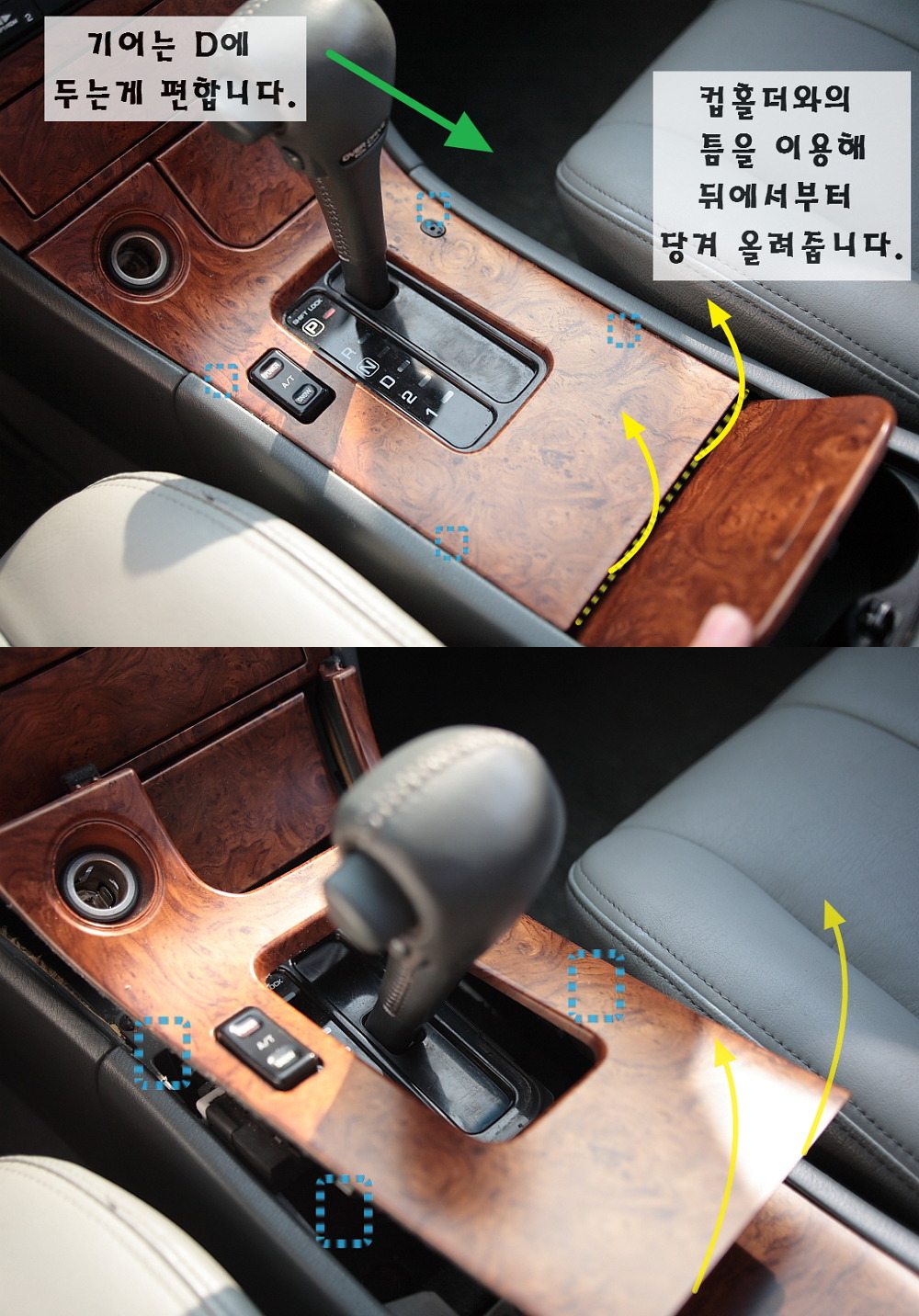 제 차는 풋-파킹브레이크라서 컵홀더와 기어우드 사이의 틈에 손을 넣어 당겨 분리했습니다.