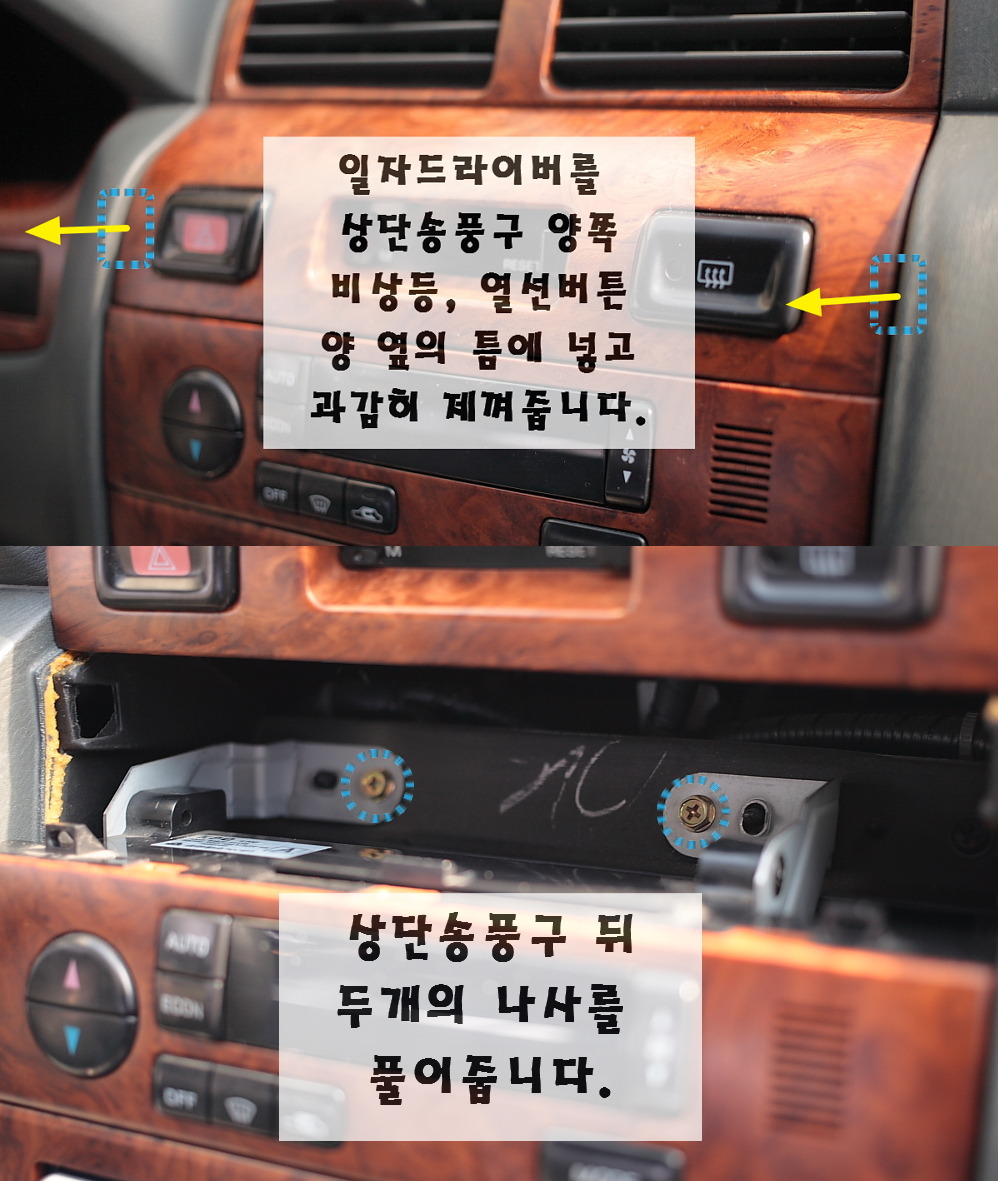 고정부위는 비상등과 열선 버튼 옆이라고 생각하시면 됩니다. 두번째 사진에 고정홈이 보이네요.