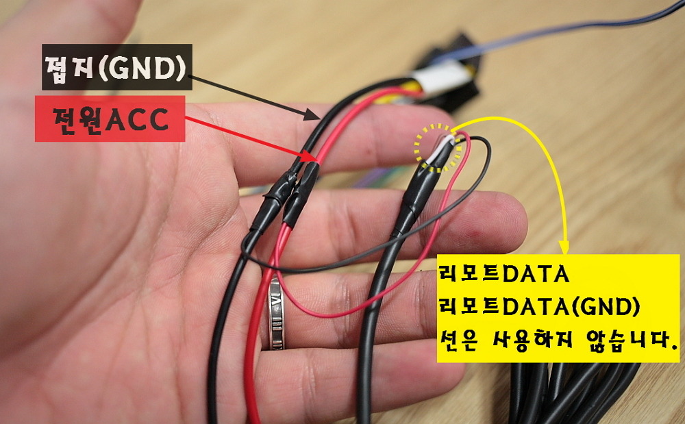 알라딘 전원선은 4개의 선이 있습니다. 그중 검은색(접지GND), 빨간색(전원ACC)만 사용합니다.