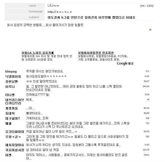 한화에 인턴으로 취직했다는데 하루만에 짤렸다는군요.