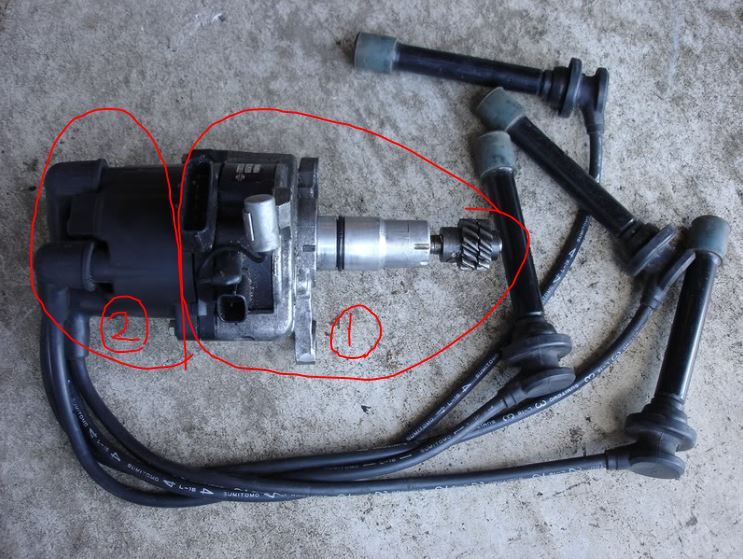 1번 점화코일이 드어있는 디스트리뷰터 몸체 / 2번 뷰터 캡 (해외 SR20DE엔진용 사진이라 약간 다를수 있어요)