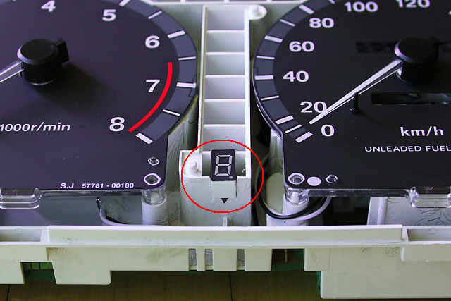 이 커버 가운데 부분은 그림과 같이 기어 인디케이터 표시기가 자리하고 있죠.(죄측은 RPM게이지, 우측은 속도계이지)