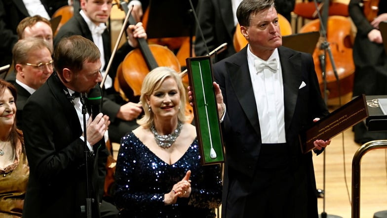 작센주 지사 Michael Kretschmer가 퇴임하는 틸레만에게 Meissen 도자기로 만든 지휘봉을 선물한다.