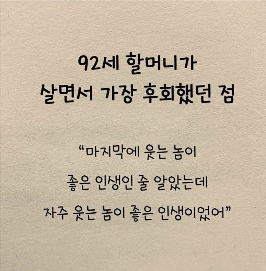 92세 할머니가 살면서 가장 후회했던 점 작성자마중물(26기권희자)|작성시간22.07.20|조회수43 목록 댓글 3 글자크기 작게가 글자크기 크게가 다음검색 현재 게시글 추가 기능 열기 북마크 공유하기 신고 센터로 신고 댓글 댓글 3 댓글쓰기 답글쓰기 댓글 리스트 작성자최복희(24기) | 작성시간 22.07.20 웃음은보약~으하하 작성자♡축복 (48기, 이영숙) | 작성시간 22.07.21 웃으면 복이 와요^^ 웃자. ㅎㅎㅎㅎㅎ 작성자미미카엘(26기이은미) | 작성시간 22.07.24 ㅎㅎㅎ 댓글 전체보기