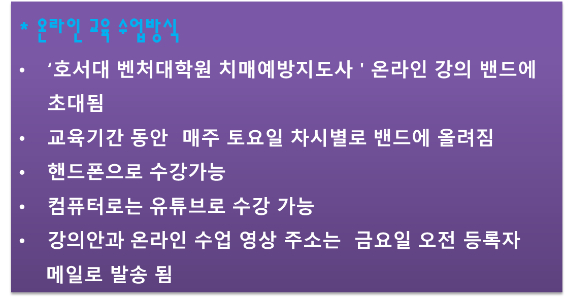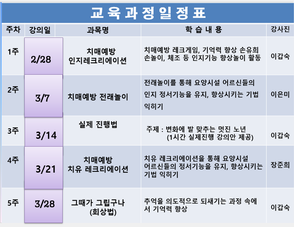 작성자사랑해 ^-^(34기 김선예) 작성시간 26.02.09 요즘 화두가 되는 치매! 이 시대에 꼭 필요한 교육입니다 기관에서 제일 인기있는 자격증이 있는 필수 과정입니다 강사님들 기다리고 계십니다 재충전의 기회로 공부하기 딱 좋은 요즈음 준비 하심도 좋을 듯 하네요 함께 하실 강사님들 기다립니다 비대면 온라인 강의 밴드에서 반가이 뵙겠습니다~^^