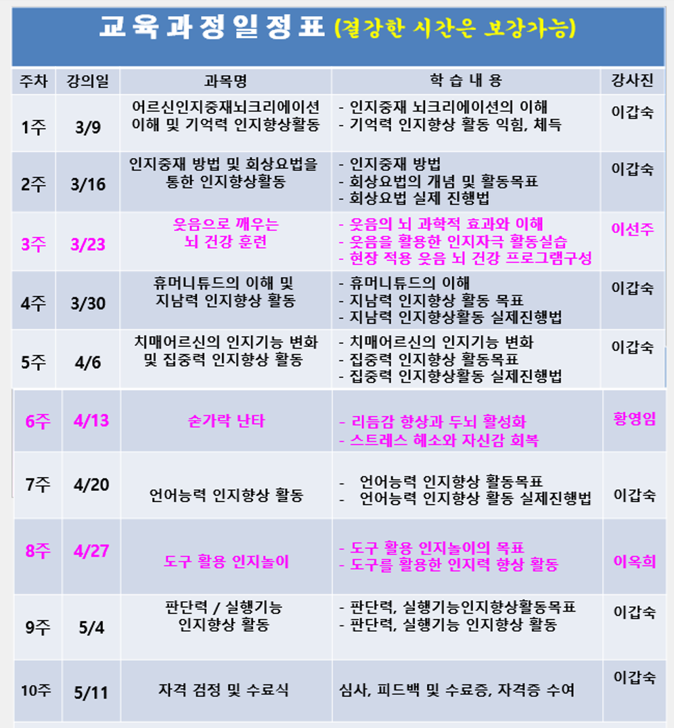 작성자♡축복 (48기, 이영숙) 작성시간 26.02.18 인지기능 향상을 돕는 전문 프로그램을 배우고,현장에서 바로 활용할 수 있도록 실습 중심으로 진행되는 지도자 과정입니다.