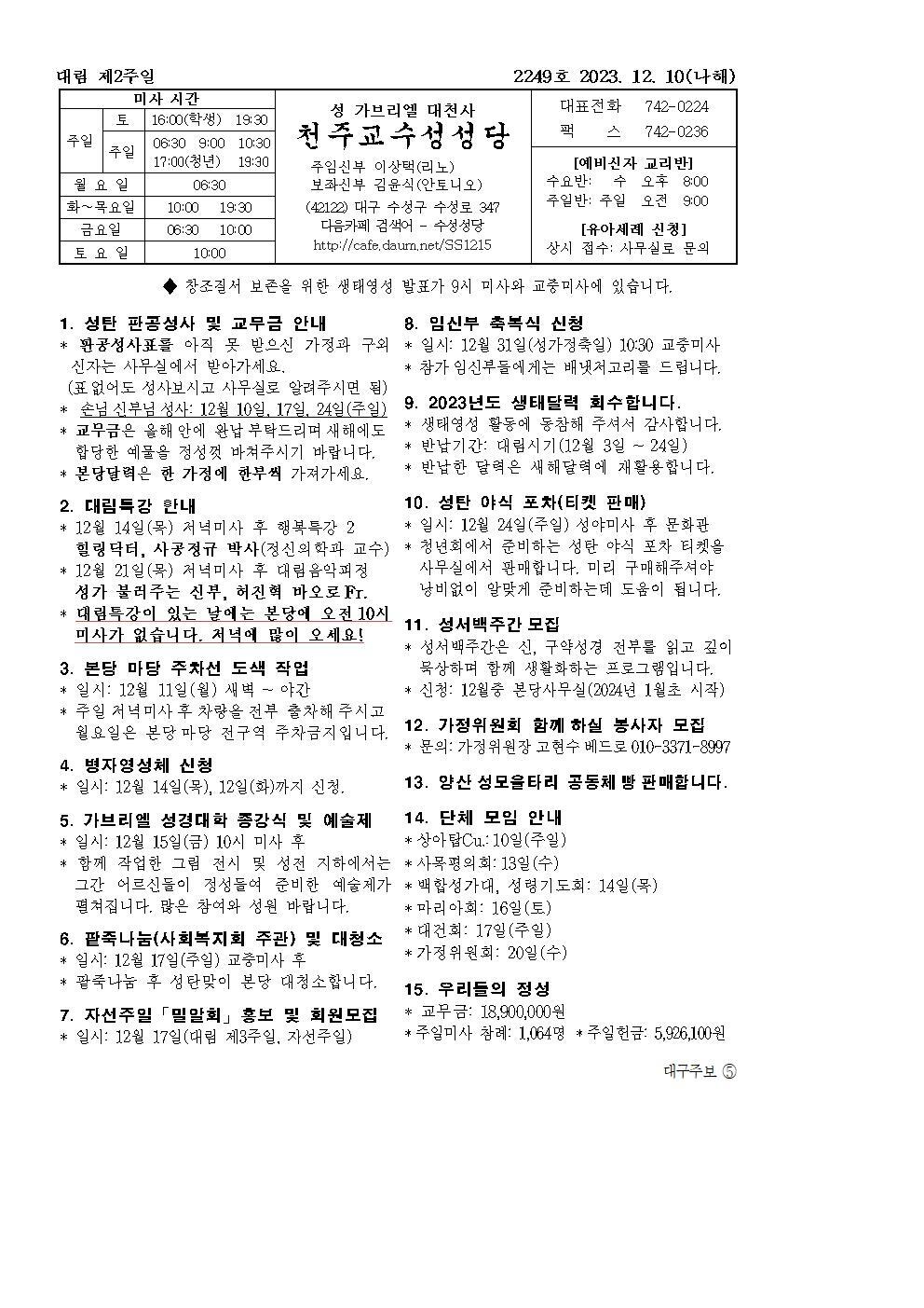 2023년 12월 10일(제2249호) 대림 제2주일(나해) 작성자수성성당|작성시간23.12.09|조회수290 목록 댓글 0 글자크기 작게가 글자크기 크게가 다음검색 현재 게시글 추가 기능 열기 북마크 공유하기 신고 센터로 신고 댓글 댓글 0 댓글쓰기 답글쓰기 댓글 리스트