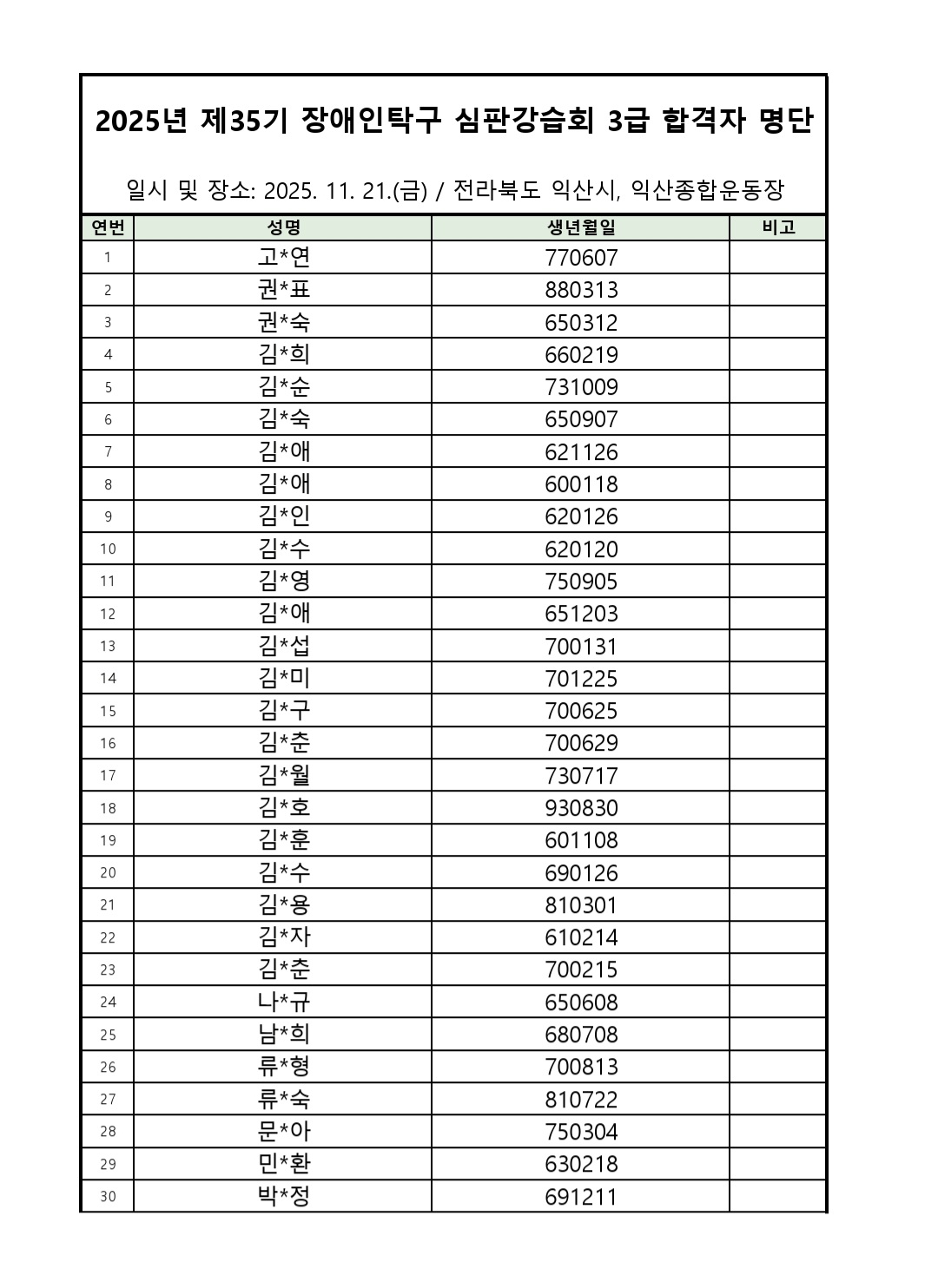 2. 2025년 제35기 장애인탁구 심판강습회 3급 합격자 명단 1부. 끝.