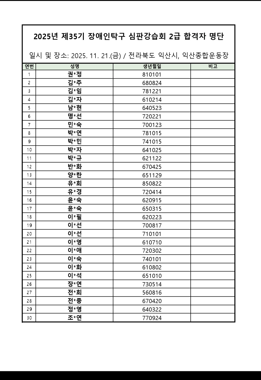 2025년 제35기 장애인탁구 심판강습회 2,3급 합격자 명단을 다음과 같이 공지합니다.