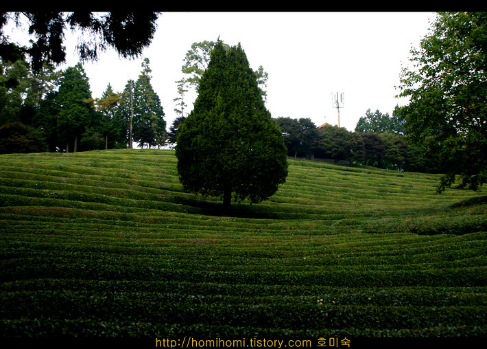 어라! 올림픽공원에서 봤던 일명 왕따나무가 여기에도 있네요 올림픽 공원의 배경은 푸른 잔디이고 이곳은 녹차밭이지요 왕따나무라 불렀지만 사실 왕따가 아니라 녹차밭을 호령하는 대장 나무 같습니다