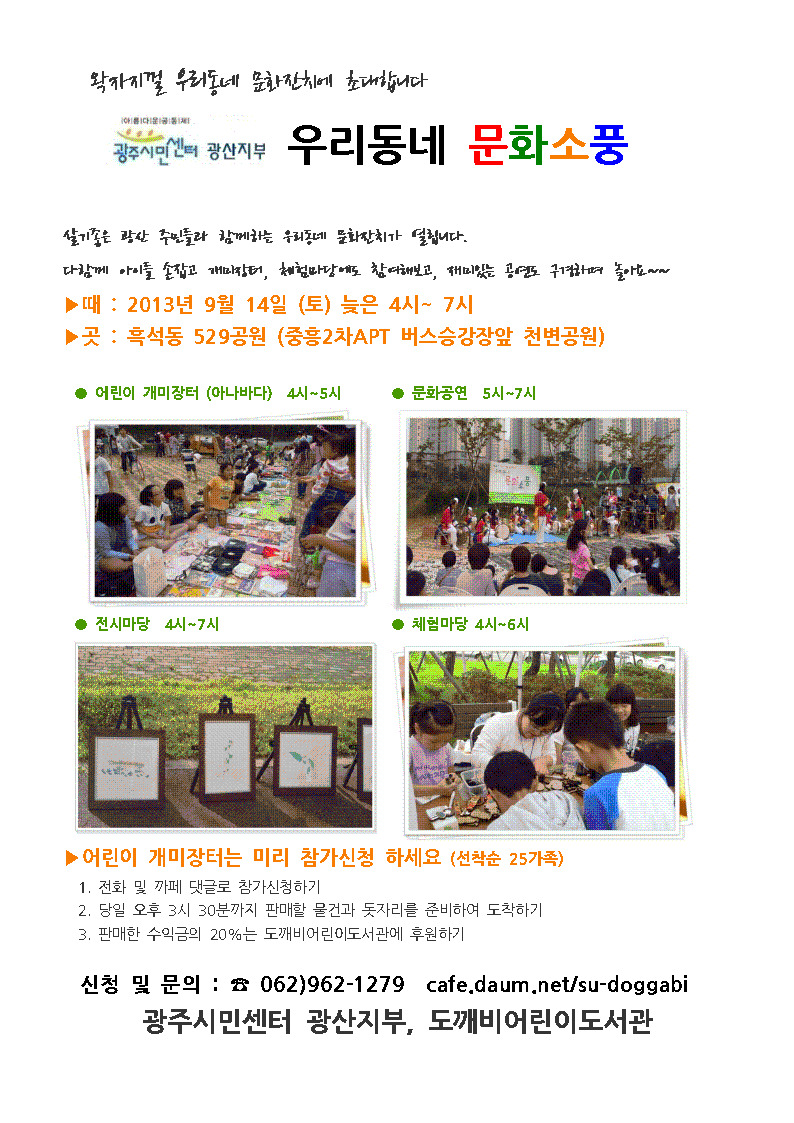 [스크랩] 우리동네문화소풍-어린이개미장터 신청 받아요. 작성자새벽별연못|작성시간13.08.19|조회수213 목록 댓글 0 글자크기 작게가 글자크기 크게가 다음검색 스크랩 원문 : 도깨비 어린이도서관 현재 게시글 추가 기능 열기 북마크 공유하기 신고 센터로 신고 댓글 댓글 0 댓글쓰기 답글쓰기 댓글 리스트