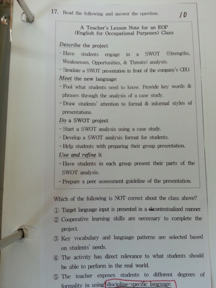 교수님 질문있습니다.discipline-specific language가 뭔가요? 작성자어화둥둥|작성시간15.07.25|조회수720 목록 댓글 1 글자크기 작게가 글자크기 크게가 기출에 나온 용어인데 뭔지 모르겠습니다. 5번 선지에 discipline-specific language가 뭔가요? 다음검색 현재 게시글 추가 기능 열기 북마크 공유하기 신고 센터로 신고 댓글 댓글 1 댓글쓰기 답글쓰기 댓글 리스트 작성자김재균(김규식) | 작성시간 15.08.01 그건 특정 분야/영역에 사용되는 용어들을 가리킵니다 댓글 전체보기
