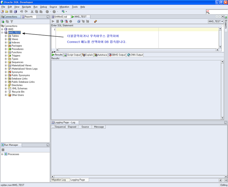 좌측 원통모양 아이콘이 DB명입니다. 그림속 설명대로 접속합니다.