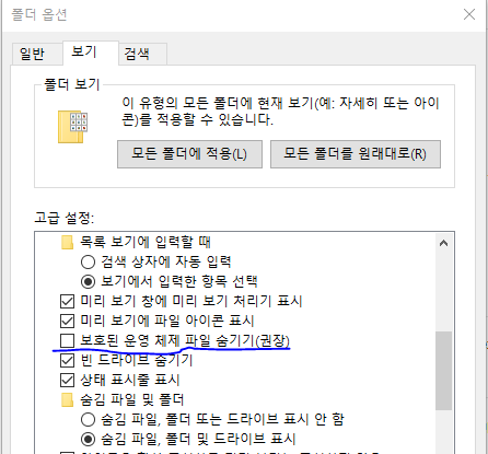 3) 보기 탭 - 보호된 운영체제 파일 숨기기(권장) - 해제