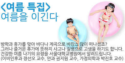 여름철 대표적인 귀질환으로는 외이도염과 급성 중이염, 이구전색 등이 있습니다. 수영 후 녹농균에 의해 범발성 외이도염이 자주 발생하게 됩니다. 녹농균은 보통 물의 표면에 존재하는데 수영장의 물의 소독에 사용하는 양의 염소(chlorine)로는 살균되지 않기 때문입니다. 급성중이염은 고막내측에 염증이 발병하는 경우로 고막천공이 있는 줄 모르고 수영을 하거나 비강내로 들어간 오염된 물이 비인강과 중이를 연결하는 이관을 통해 세균 등이 파급되어 발생할 수 있습니다. 이구전색은 외이도에 있던 귀지가 외이도에 들어가는 물을 흡수하면서 부피가 팽창하면서 외이도를 막게 되는 것으로서 통증을 일으키고 균의 배양지 역할도 하게 됩니다. 귓병이 잘 생기는 사람의 경우 수영은 삼가하는 것이 좋고 수영 후 즉시 희석시킨 식초물이나 점이액을 사용하여 청결하고 건조하게 유지하도록 하는 것이 여러 가지 귓병의 예방에 가장 중요할 것으로 생각됩니다. 그리고 휴가 이후 조금이라도 의심가는 증상이 있을 경우 조기에 이비인후과를 방문하시는 것이 좋습니다. | ||