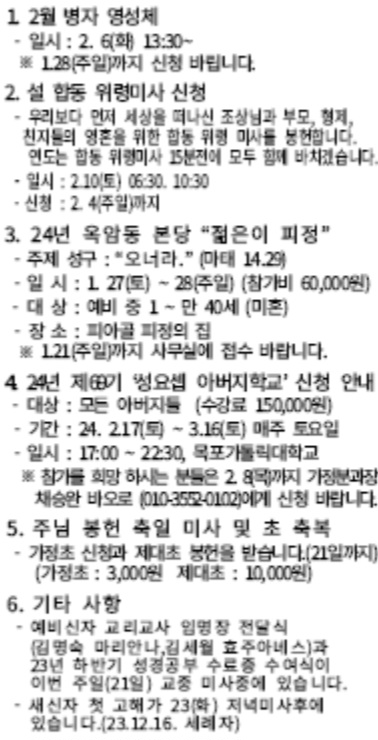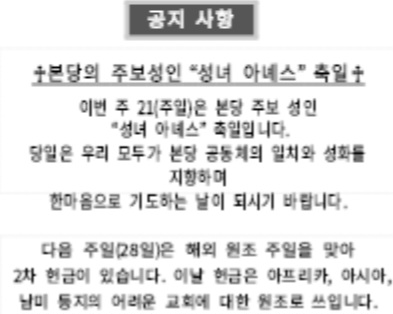 2024. 1. 21. 연중 제3주일 (하느님의 말씀주일) 공지사항입니다 작성자이지은(소피아)|작성시간24.01.21|조회수92 목록 댓글 0 글자크기 작게가 글자크기 크게가 다음검색 현재 게시글 추가 기능 열기 북마크 공유하기 신고 센터로 신고 댓글 댓글 0 댓글쓰기 답글쓰기 댓글 리스트
