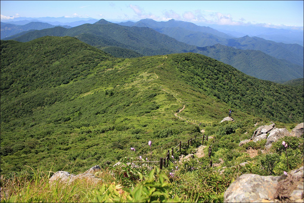무룡산을 지나 완만한 능선길이 펼쳐지며, 해발 1,500m에 펼쳐진 너른 고원 덕유편전의 계절마다 모습을 바꾸는