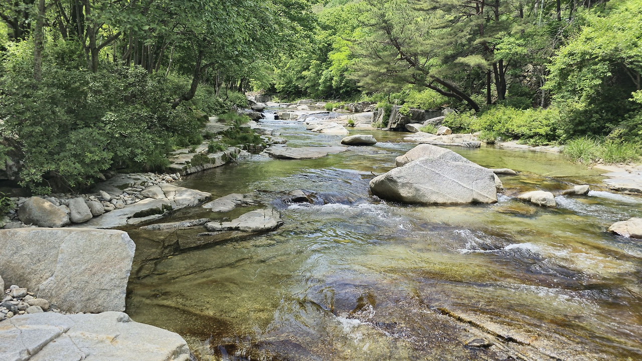 명경지수같은 소와 작은 폭포들, 너른 화강암반 위로 신선이 바둑을 두었다는 "사선대"의