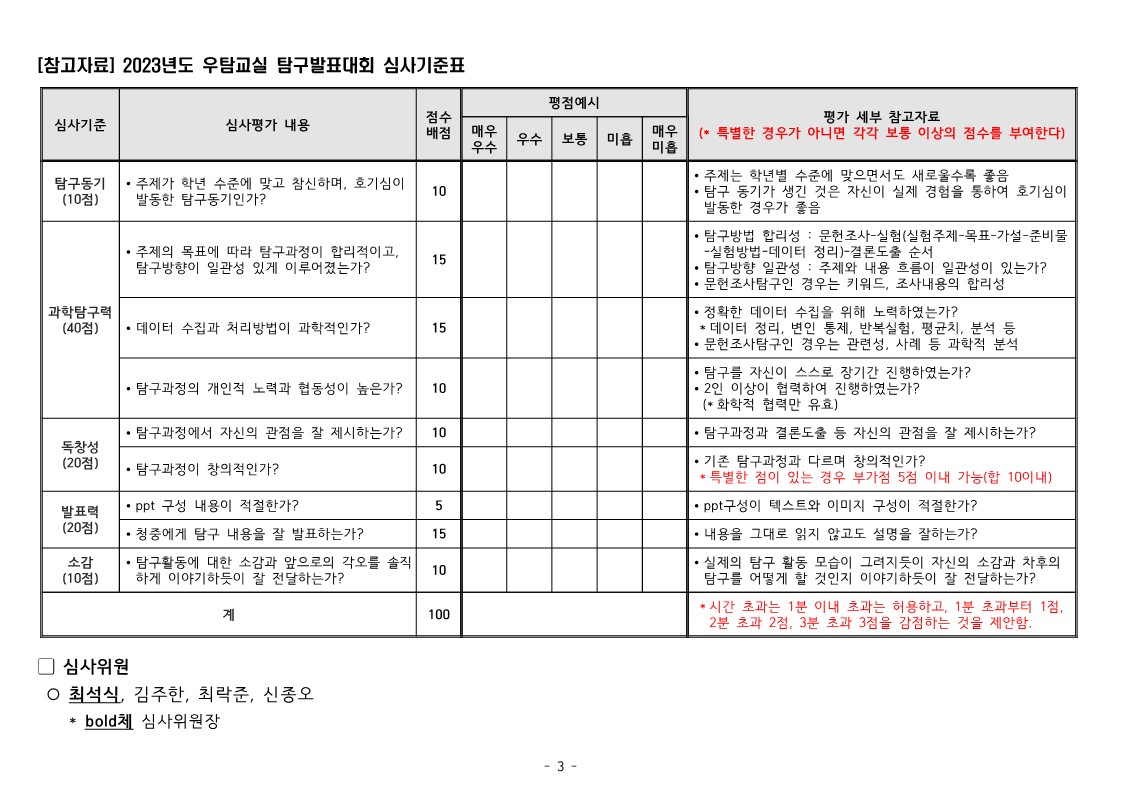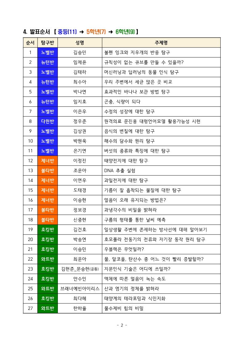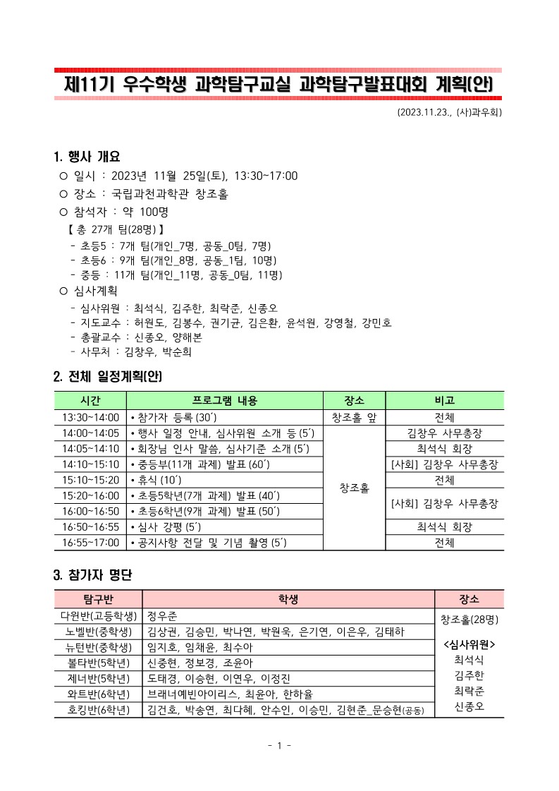 제11기 우수학생 과학탐구교실 과학탐구발표대회 계획(안) 작성자과우회|작성시간23.11.23|조회수176 목록 댓글 0 글자크기 작게가 글자크기 크게가 다음검색 현재 게시글 추가 기능 열기 북마크 공유하기 신고 센터로 신고 댓글 댓글 0 댓글쓰기 답글쓰기 댓글 리스트