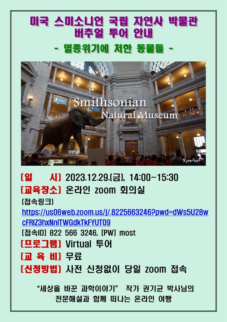 12/29(금) 버추얼투어 '멸종위기에 처한 동물들' 참여 안내 작성자과우회|작성시간23.12.26|조회수64 목록 댓글 0 글자크기 작게가 글자크기 크게가 ※ 온라인 진행되오니, 많은 관심과 참여 부탁드립니다. 다음검색 현재 게시글 추가 기능 열기 북마크 공유하기 신고 센터로 신고 댓글 댓글 0 댓글쓰기 답글쓰기 댓글 리스트