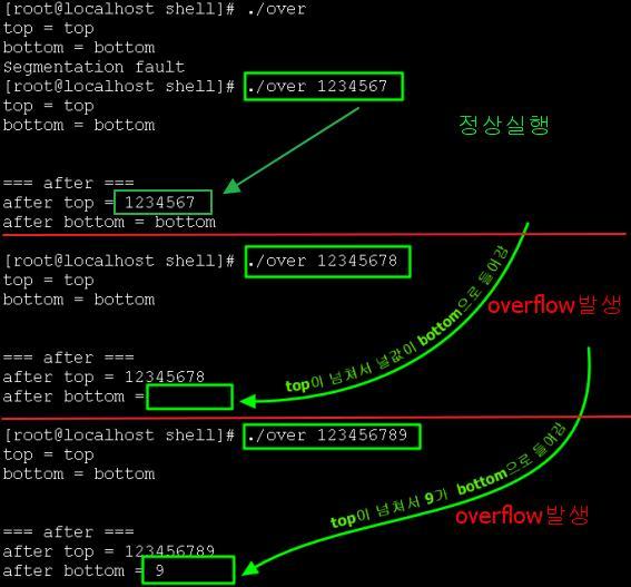 정상실행이라함은 인자를 top의 저장범위인 7자이하를 넣는것이고 , 오버플로우는 8자이상 입력하는 것을 말한다.