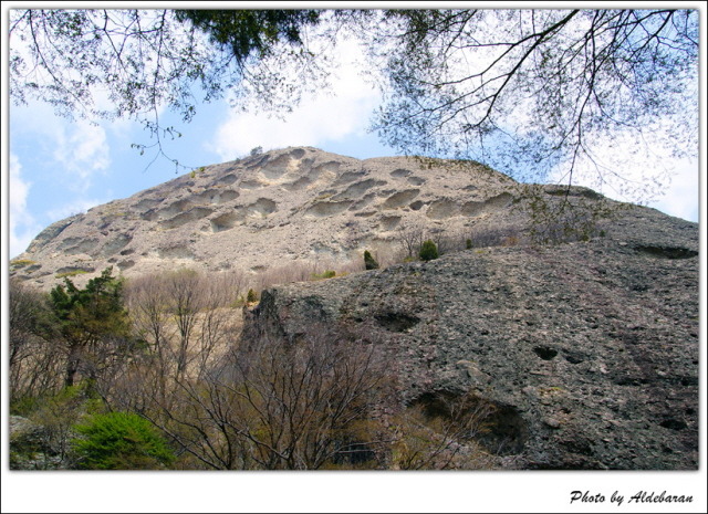 남부주차장쪽으로 내려오면서 봉우리 중턱 급경사면에 군데군데 마치 포탄을 맞은 듯 음푹 패인 굴들이 보이고 레미콘을 부은 것마냥 돌들이 박혀있다. 마이산도립공원 사이트를 보니 학술용어로 타포니 지형이라 한다. 풍화작용은 보통 바위 표면에서 시작되나 마이산은 내부가 팽창하서 밖에 있는 바위 표면을 밀어내 만들어졌다. 진안 마이산은 중생대 후기 약 1억년전까지 담수호였다고 전한다. 약 7천만년전 지각 변동으로 융기되어 이루어졌으며 지금도 민물고기 화석이 간혹 발견되고 있다는 설명도 곁들였다.