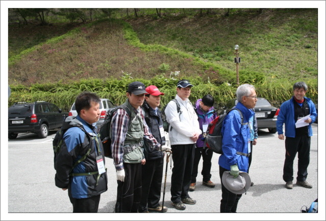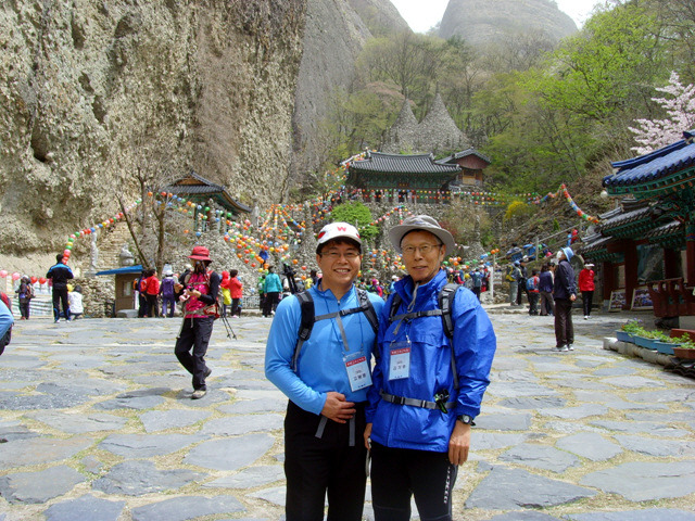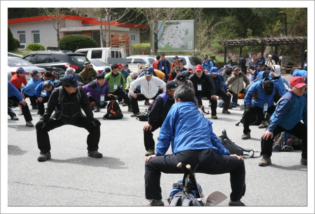 또 마이산의 전설도 있다. “아득한 옛날 신선부부가 살았다. 마침내 승천할 때가 되자 남신이 말했다 "사람들이 승천하는 광경을 보면 부정을 타서 안되니 한밤중에 떠나자고" 하였다. 하지만 여신은 새벽에 떠나자고 하였다. 여신의 뜻을 쫒아 새벽녘에 승천할 즈음 때마침 일찍 물길러온 동네 아낙이 목격을 하게 되었다 "어머나 산이 하늘로 올라가네" 하고 소리치자 승천이 틀린 것을 안 남신은 화가 났다. 두 자식을 빼앗아 그 자리에서 바위산을 이루고 주저앉았다 한다. 구전되어 내려온 전설이긴 하지만 진안읍에서 마이산을 보면 숫마이봉은 새끼봉이 둘 붙어있고 서쪽 암마이봉은 죄스러움에 반대편으로 고개를 떨구고 있는 형상을 취하고 있다. 북부주차장에 도착 후 마당에서 간단한 스트레칭 후 기념촬영. 산행에 앞서 하는 스트레칭이 산악회의 전통으로 이어졌으면 좋겠다.