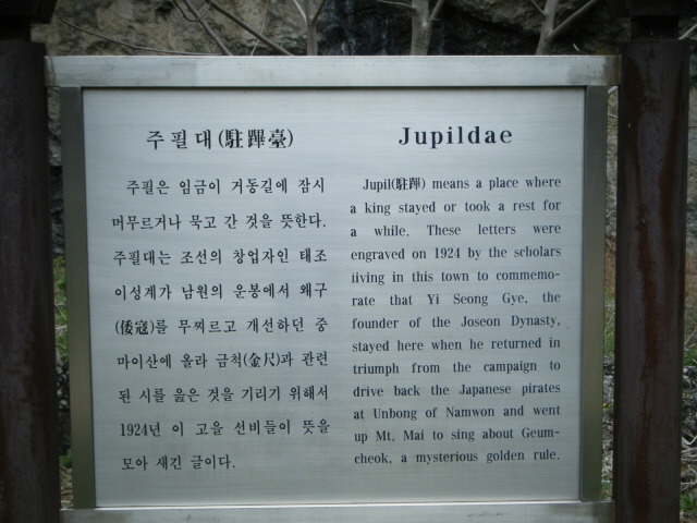 매표소 입구쪽에 넓직한 큰 바위가 보인다. 안내판이 있다. 주필대(駐蹕臺)와 이산묘와 사당과 비석들이 들어서있다. 조선시대의 발자취가 곳곳에 서려 있는 곳이다. 주필대(駐蹕臺)는 이성계가 1380년(고려 우왕6) 남원 운봉전투에서 왜구를 무찌르고 전주로 개선하던 중 수레를 멈추어 쉬어 갔던 곳으로 조선 개국의 꿈을 지폈던 현장이다.
