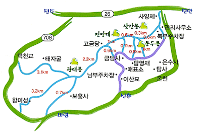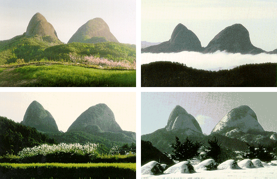 계절에 따라 산의 이름도 달랐다. 봄에는 안개를 뚫고 나온 두 봉우리가 쌍돛배 같다 하여 돛대봉, 여름에는 수목이 울창해져 용의 뿔처럼 보인다 하여 용각봉, 가을에는 단풍 든 모습이 말의 귀 같다 해서 마이봉, 겨울에는 눈이 쌓이지 않아 먹물을 찍은 붓끝처럼 보이므로 문필봉이라 부른다.
