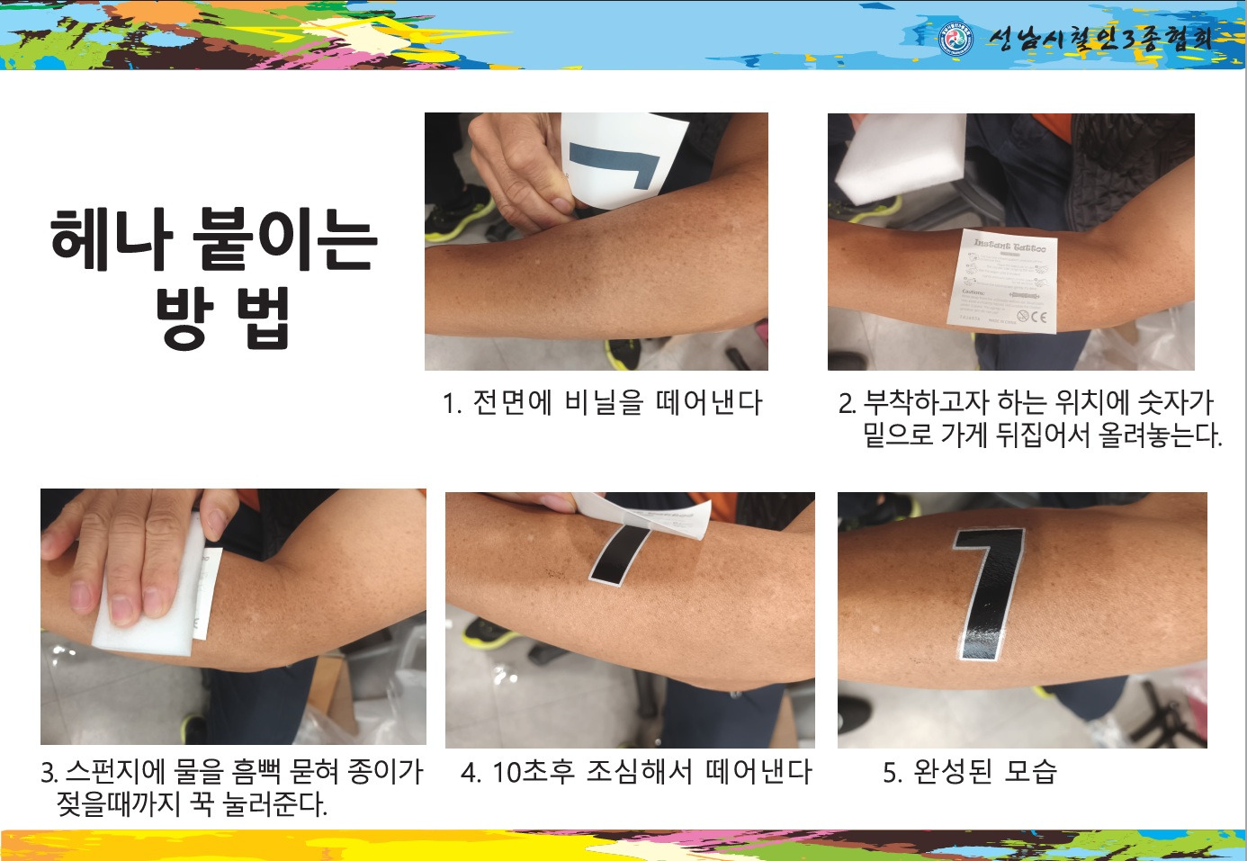 헤나 부착은 선수 인식, 탈의실 출입을 위하여 반드시 팔뚝에 부착되어야 합니다.