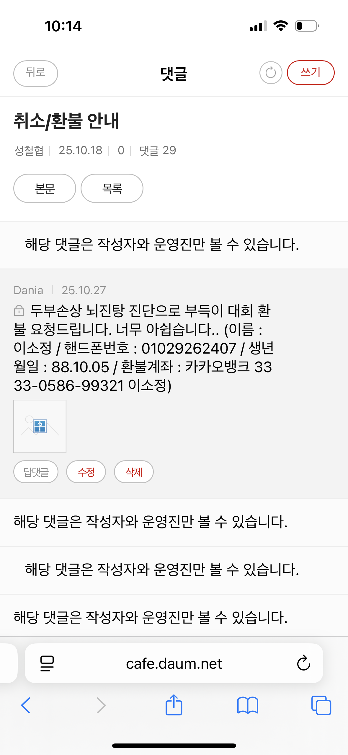 진단서 포함 환불 요청 작성자Dania|작성시간25.10.30|조회수229 목록 댓글 1 글자크기 작게가 글자크기 크게가 아래 글에 피드백 받지못해 다시 게시합니다.성남 수영대회 안내문자[Web발신]2005 성남시철인3종협회장배 장거리 수영대회 안내문자 이름 : 이소정배번호 : 648 다음검색 현재 게시글 추가 기능 열기 북마크 공유하기 신고 센터로 신고 댓글 댓글 1 댓글쓰기 답글쓰기 댓글 리스트 작성자성철협 | 작성시간 25.10.31 이전글에 계좌번호 남겨주셨었는데,진단서/진료비영수증 등이 없어서 기다리는 중이었습니다.확인해주셨으니 바로 처리해드리겠습니다 ^^ 댓글 전체보기