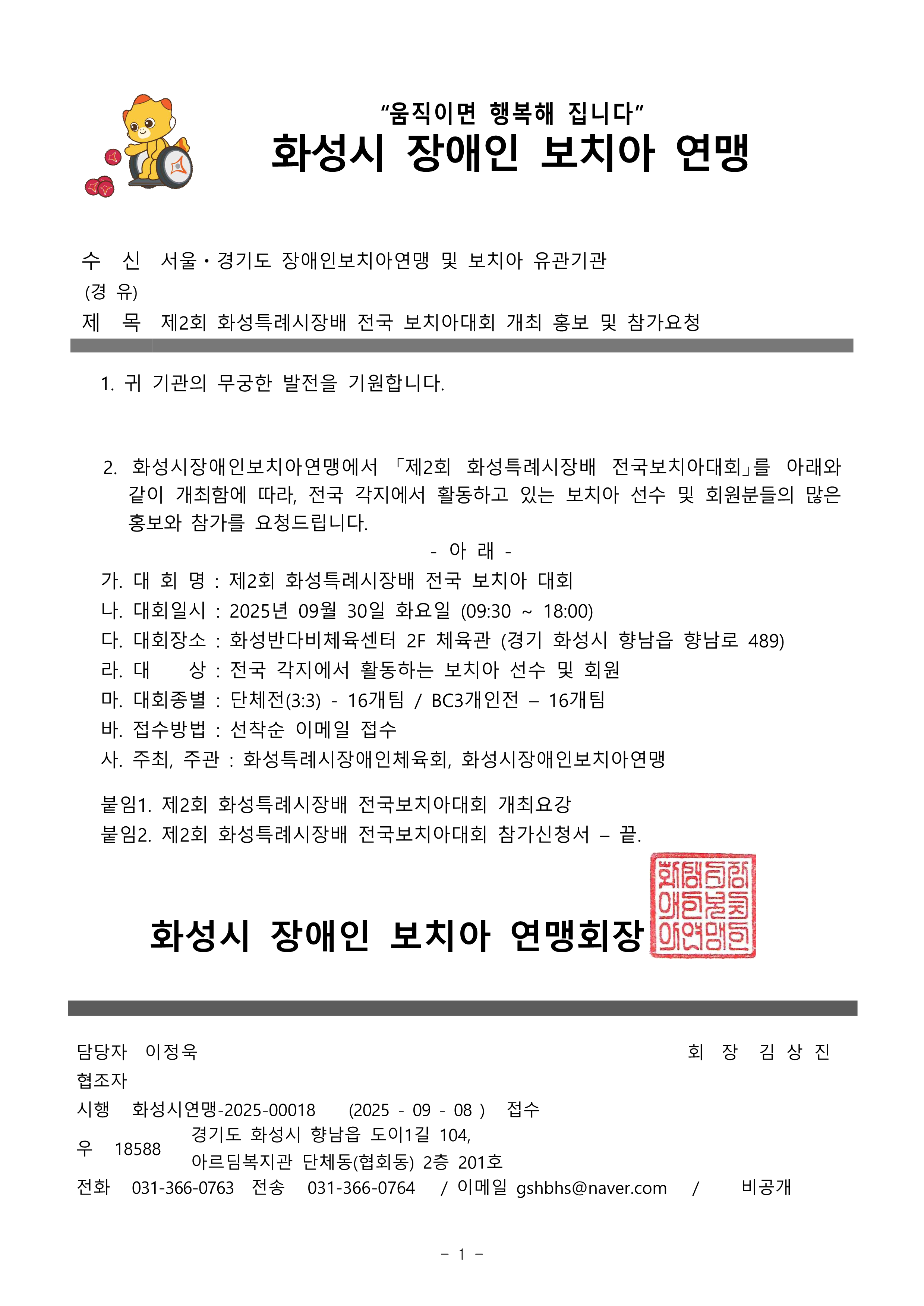 제2회 화성특례시장배 전국보치아대회 개최안내드립니다. 작성자wooki|작성시간25.09.18|조회수82 목록 댓글 0 글자크기 작게가 글자크기 크게가 안녕하세요, 화성시장애인보치아연맹 이정욱입니다. 다가오는 9월30일, 화성특례시에서 전국 보치아대회를 개최합니다. 많은 선수분들의 참여 부탁드리겠습니다. 감사합니다^^ 제2회 화성특례시장배 전국보치아대회 참가요강.pdf587.09KB제2회 화성특례시장배 전국보치아대회 참가신청서.hwp51.00KB 첨부파일첨부된 파일이 3개 있습니다. png 파일 제2회 화성특례시장배 전국보치아대회 참가안내 공문.png 다운로드 pdf 파일 제2회 화성특례시장배 전국보치아대회 참가요강.pdf 다운로드 hwp 파일 제2회 화성특례시장배 전국보치아대회 참가신청서.hwp 다운로드 다음검색 현재 게시글 추가 기능 열기 북마크 공유하기 신고 센터로 신고 댓글 댓글 0 댓글쓰기 답글쓰기 댓글 리스트