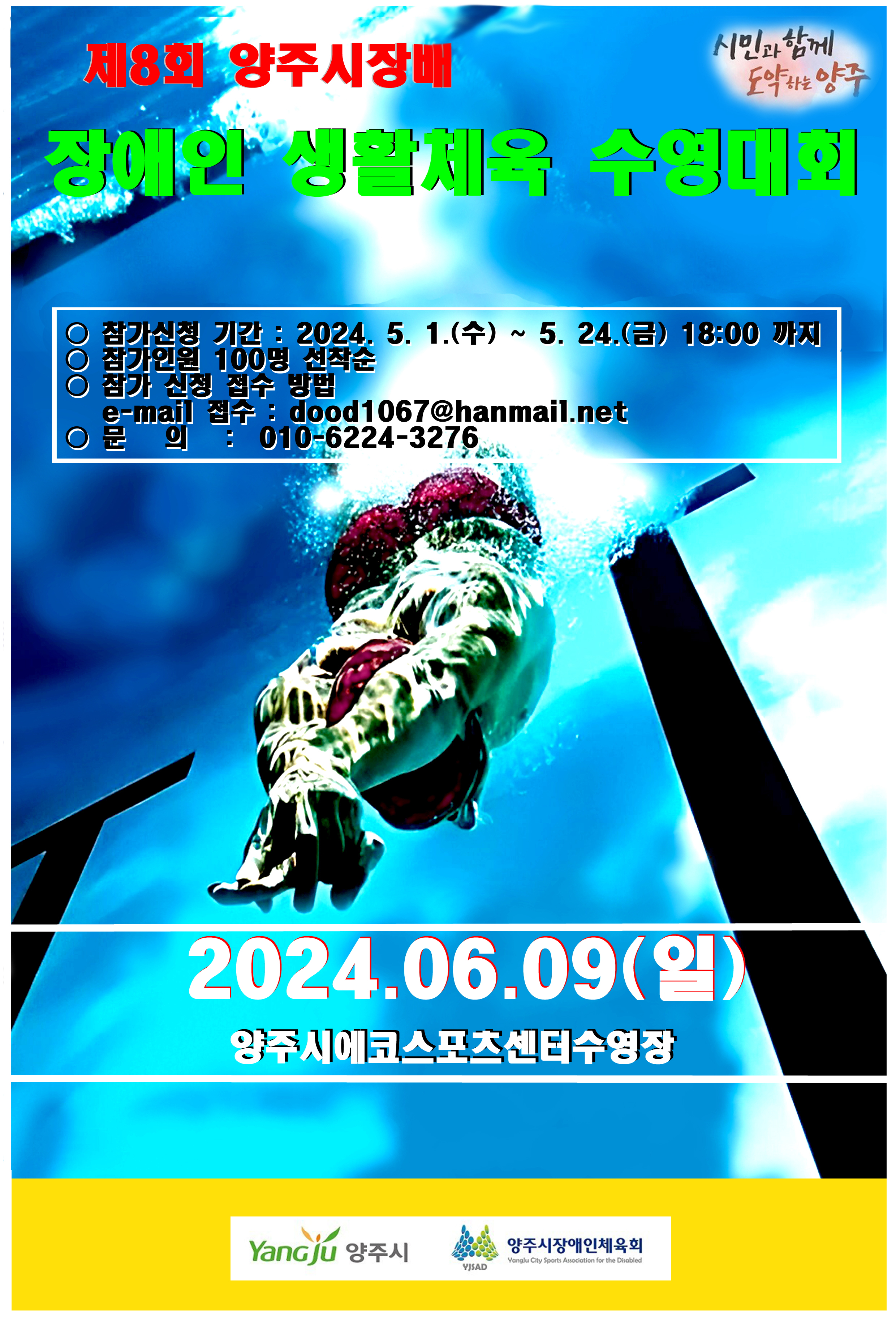 제8회 양주시장배 장애인 생활체육 수영대회 (요강) 작성자최창수|작성시간24.04.20|조회수73 목록 댓글 0 글자크기 작게가 글자크기 크게가 제8회 양주시장배 장애인 생활체육 수영대회 참가신청 및 요강아래 첨부 파일을 다운 받으시고 작성 후 메일로 접수 하세요~!제8회 양주시장배 장애인 생활체육 수영대회 참가요강.hwp55.00KB 첨부파일첨부된 파일이 2개 있습니다. jpg 파일 2024 제8회 양주시장배 장애인생활체육 수영대회 포스터-완성.jpg 다운로드 hwp 파일 제8회 양주시장배 장애인 생활체육 수영대회 참가요강.hwp 다운로드 다음검색 현재 게시글 추가 기능 열기 북마크 공유하기 신고 센터로 신고 댓글 댓글 0 댓글쓰기 답글쓰기 댓글 리스트