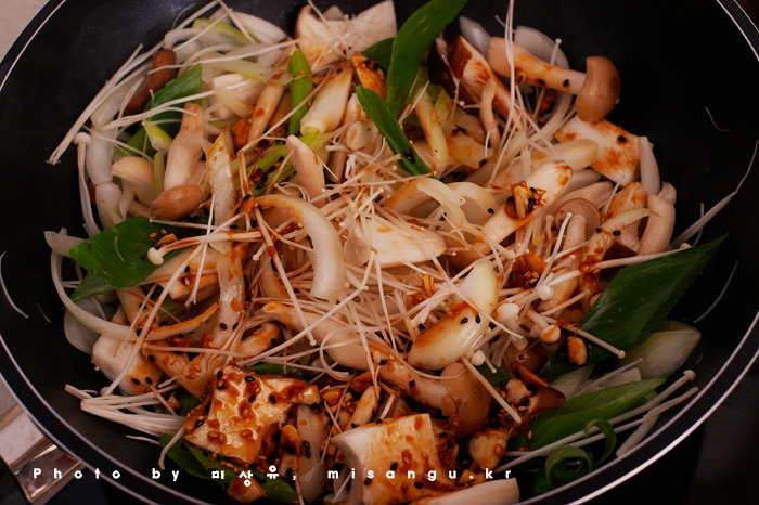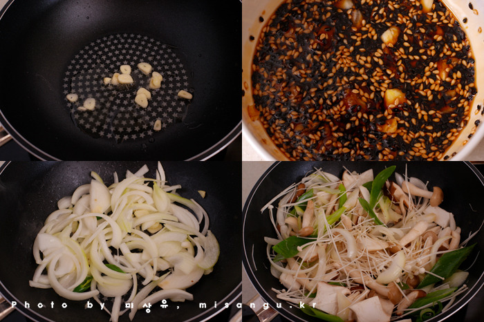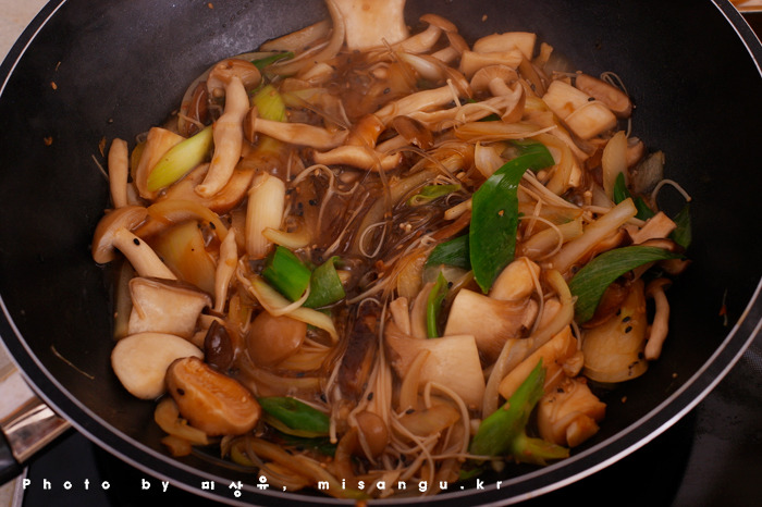 식용유 - 마늘 - 양파 - 버섯, 대파, 고추 - 양념 - 육수 - 당면 순으로 넣어가며 볶아 주세요.