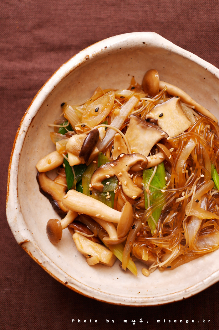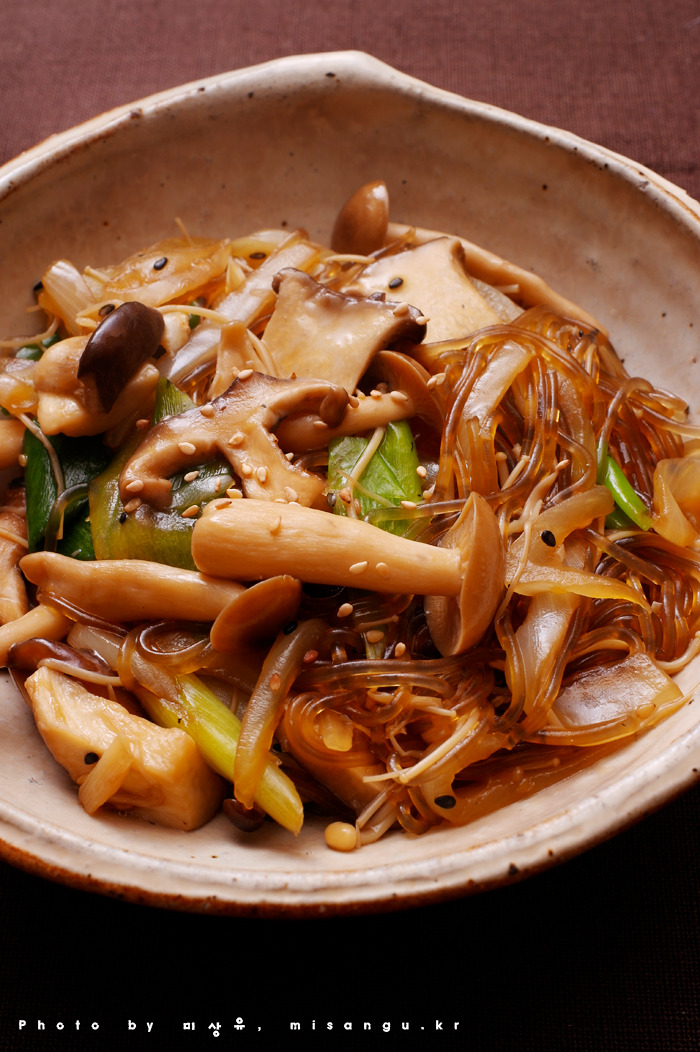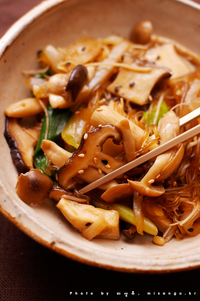 백만송이 버섯 등등 먹고 싶은 버섯 적당량, 대파 1/2뿌리, 고추 1개, 물에 불린 당면 반줌, 참기름 1큰술,