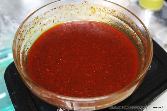 양념장 : 고추장 6큰술, 간장 1큰술, 올리고당 4큰술, 매실청 2큰술, 식초 4큰술, 고추가루 2큰술