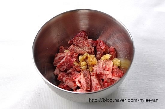 고기는 다음의 양념재료로 무쳐서 20분간 재워두세요.