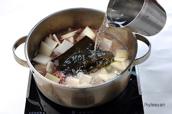 다진마늘1큰술, 생강즙(또는 생강가루)1/3큰술, 참기름1큰술, 물8컵, 소금, 후추약간
