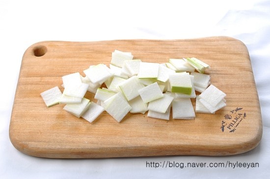 무는 깨끗이 씻어서 사방 2.5cm 크기로 얇게 나박썰어요.