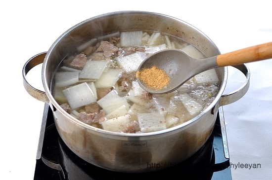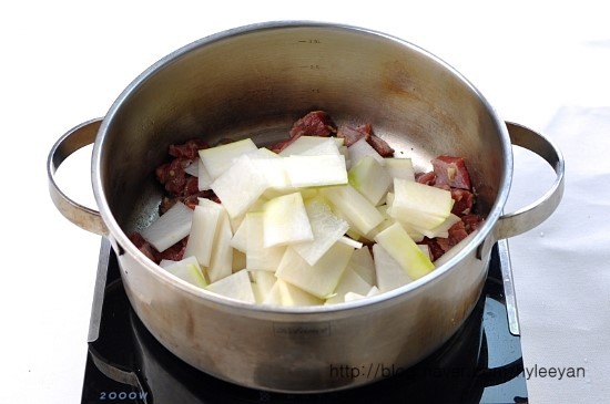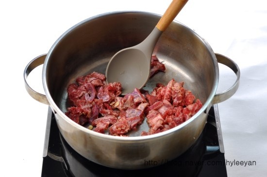 쇠고기를 볶다가 무를 넣고 함께 볶아요.