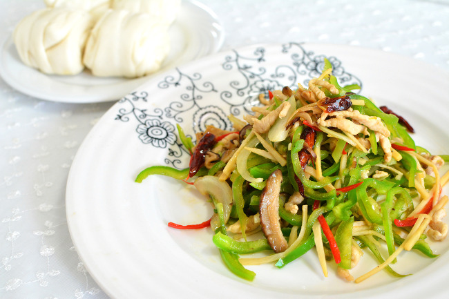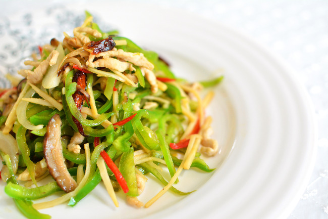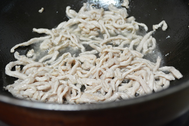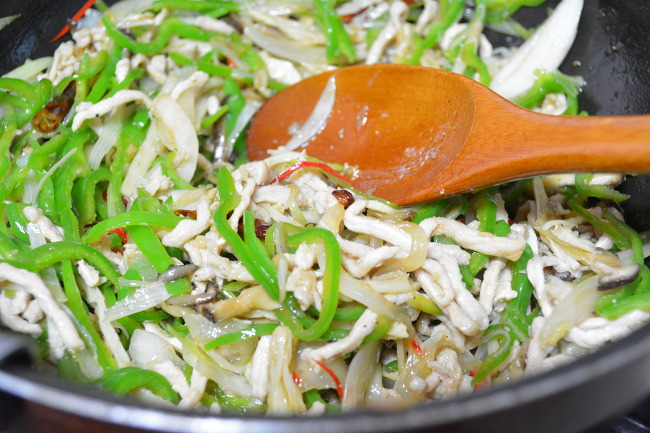5. 팬을 뜨겁게 달군 후(이게 제일 중요하죠.) 기름을 두르고 충분하게 가열해 줍니다. 고추, 대파, 마늘,. 생강을 넣어 볶아 향을 내고, 야채를 투입한 후 팬을 몇번 빠르게 돌린 후, 돼지고기채와, 죽순, 표고버섯을 넣어줍니다. 이후 2~3회 흔들고 가장자리로 액체조미료(간장, 굴소스, 정종의 혼합물)을 빙 둘러 주고 몇번 더 흔들어 줍니다. 이후 소금과 약간의 조미료, 후추가루로 마무리 간을 한후 참기름을 조금 치고 팬에서 내리면 끝~!