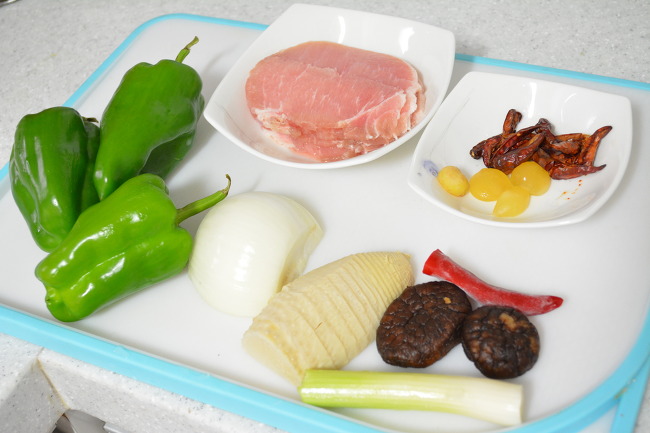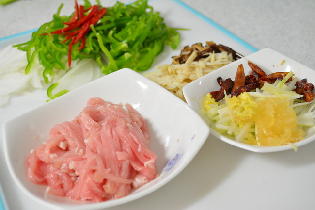 2. 피망, 양파, 홍고추, 죽순, 표고버섯, 대파, 돼지고기를 모두 채썰어줍니다. 마늘은 다져주고` 생강도 다져주세요.