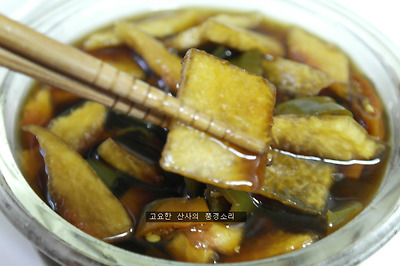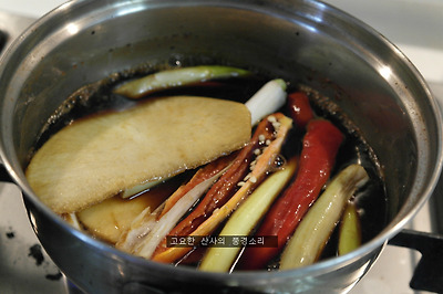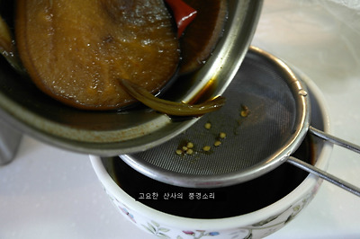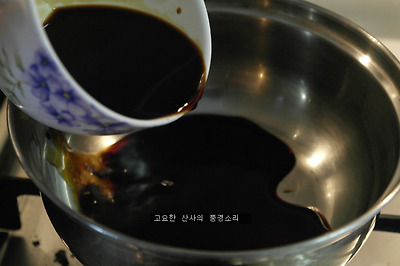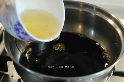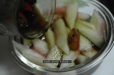 ㉡ 양념은 식초 : 꿀(설탕) : 진간장 = 1:1:1 이 되게 하고 양은 수박껍질이 잠길락 말락 한 정도 (수박 껍질에서 물이 생김)